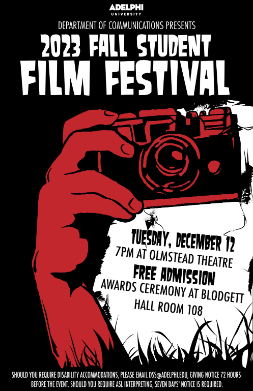 Advertising poster design for the 2023 Fall Student Film Festival, hosted by the Adelphi University Department of Communications. All assets designed using Adobe Illustrator.